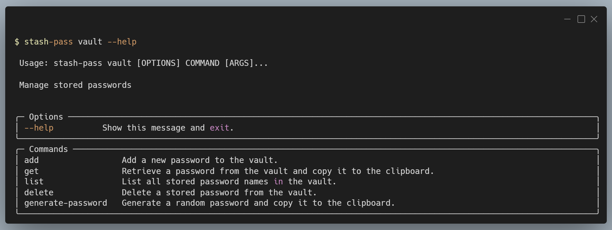 This allows you, dear reader, to simply run pipx install stash-pass-cli (or pip install --user stash-pass-cli if you're not using pipx) and the functionality of the CLI is available to you. What are those lovely features?