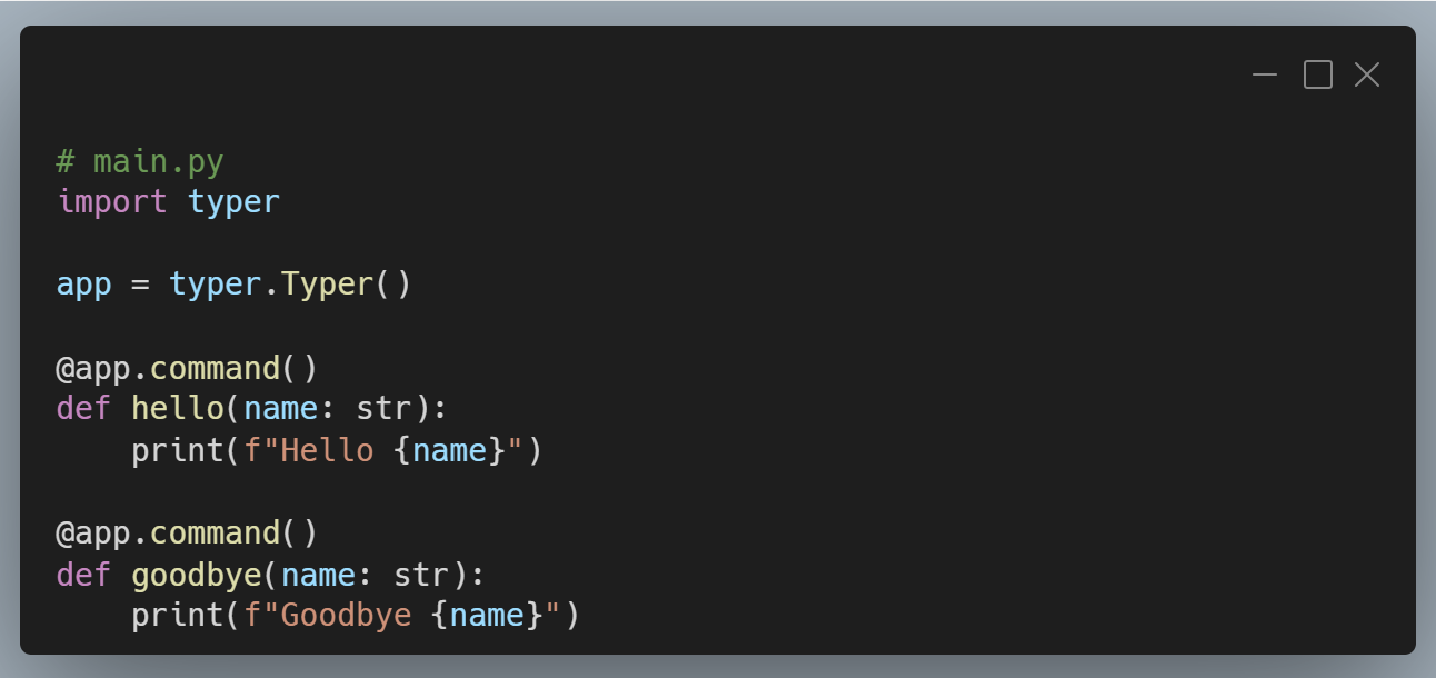 Typer is a robust Python library for building command-line interfaces. If you are familiar with libraries like Flask, picking up Typer should be a breeze. Here's an example:
