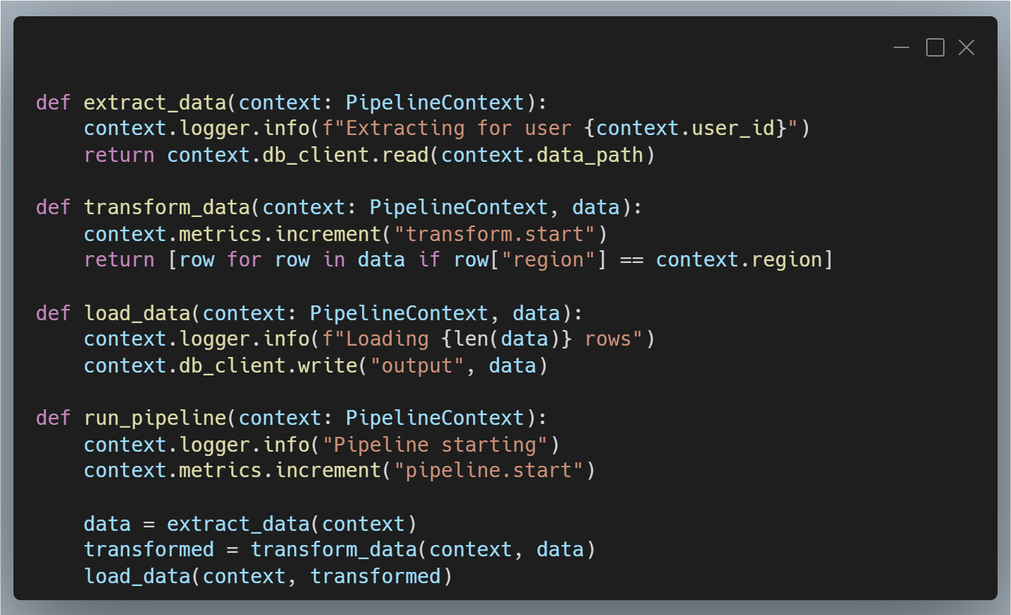 - It scales naturally. More pipelines? Reuse or extend your context class.